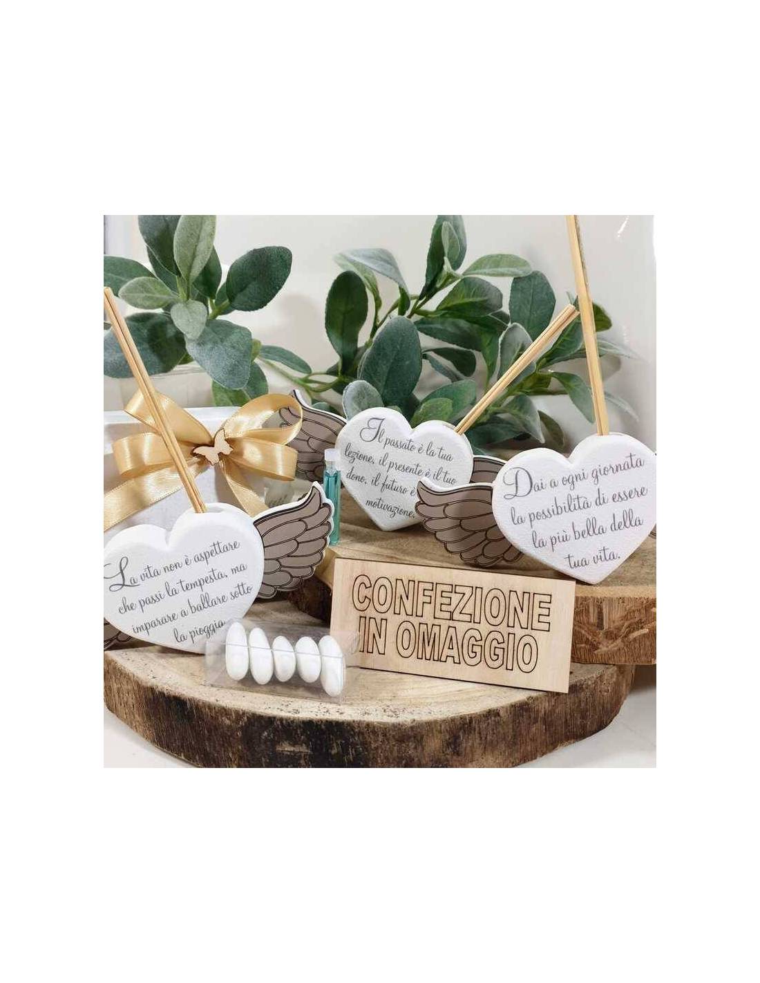 Bomboniere diffusore profumo a forma di cuore con diverse frasi incise e ali colorate