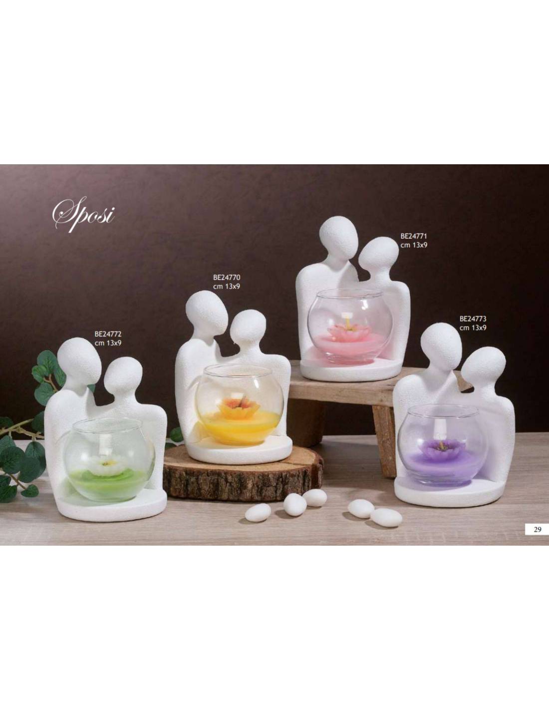 Imperdibili bomboniere matrimonio originali sposi stilizzati in polvere di ceramica con candele profumate colori variegati.