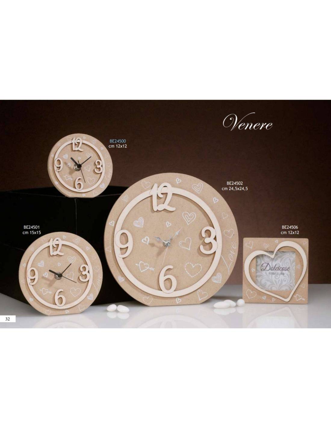 Eleganti idee bomboniere matrimonio in legno Linea Venere con possibilità di scelta tra bomboniere orologio (disponibili in tre misure differenti) e bomboniere portafoto.