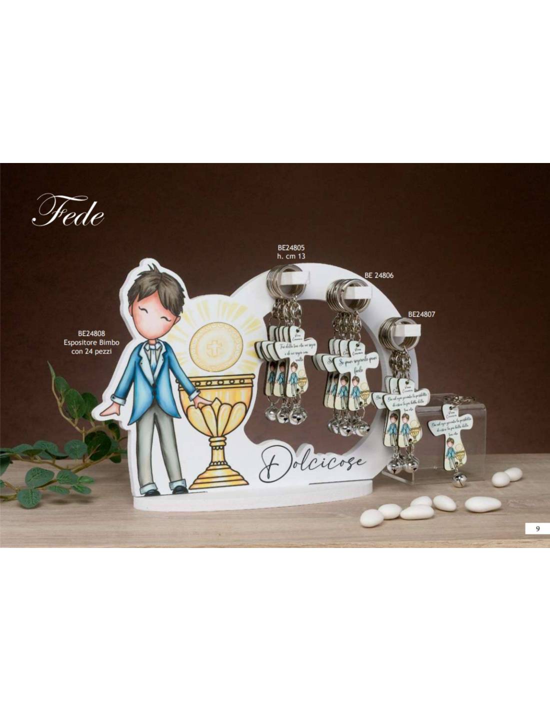 Linea Fede Dolcicose bomboniere comunione maschio portachiavi a forma di croce con bimbo comunione calice. È possibile scegliere tra tre modelli di bomboniere portachiavi con tre frasi differenti.