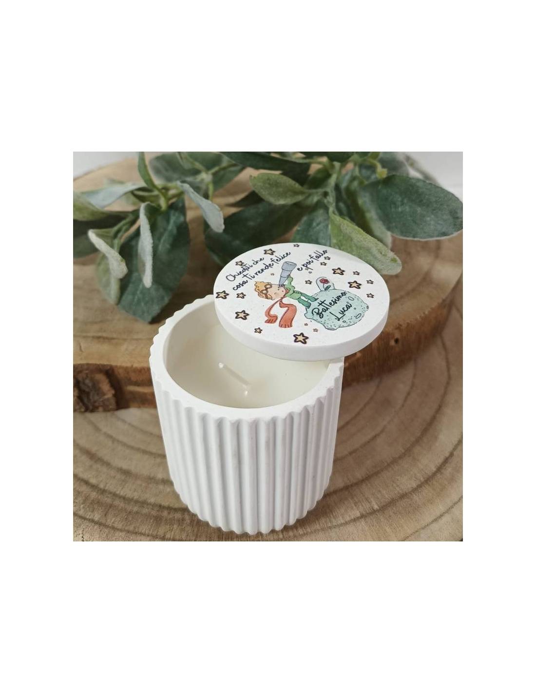 Il Piccolo principe bomboniere candela coperchio con frase "Chiediti che cosa ti rende felice e poi fallo" con personalizzazione.
