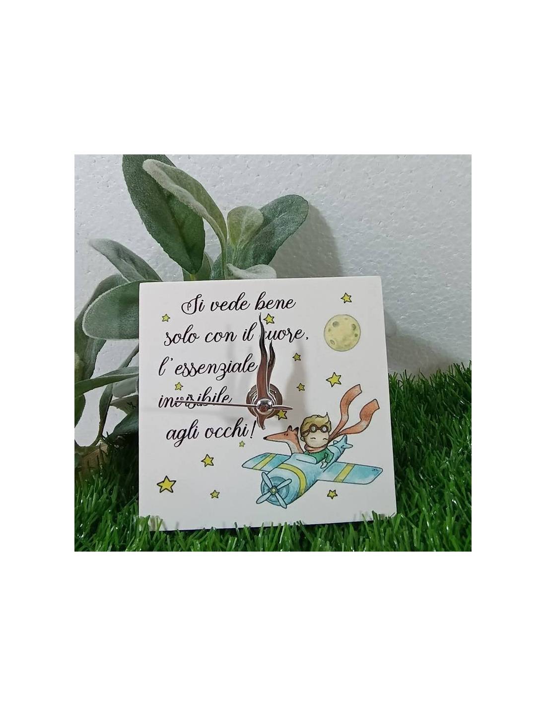 Bomboniere Battesimo piccolo principe orologio quadrato con frase "Si vede bene solo con il cuore, l'essenziale è invisibile agli occhi".
