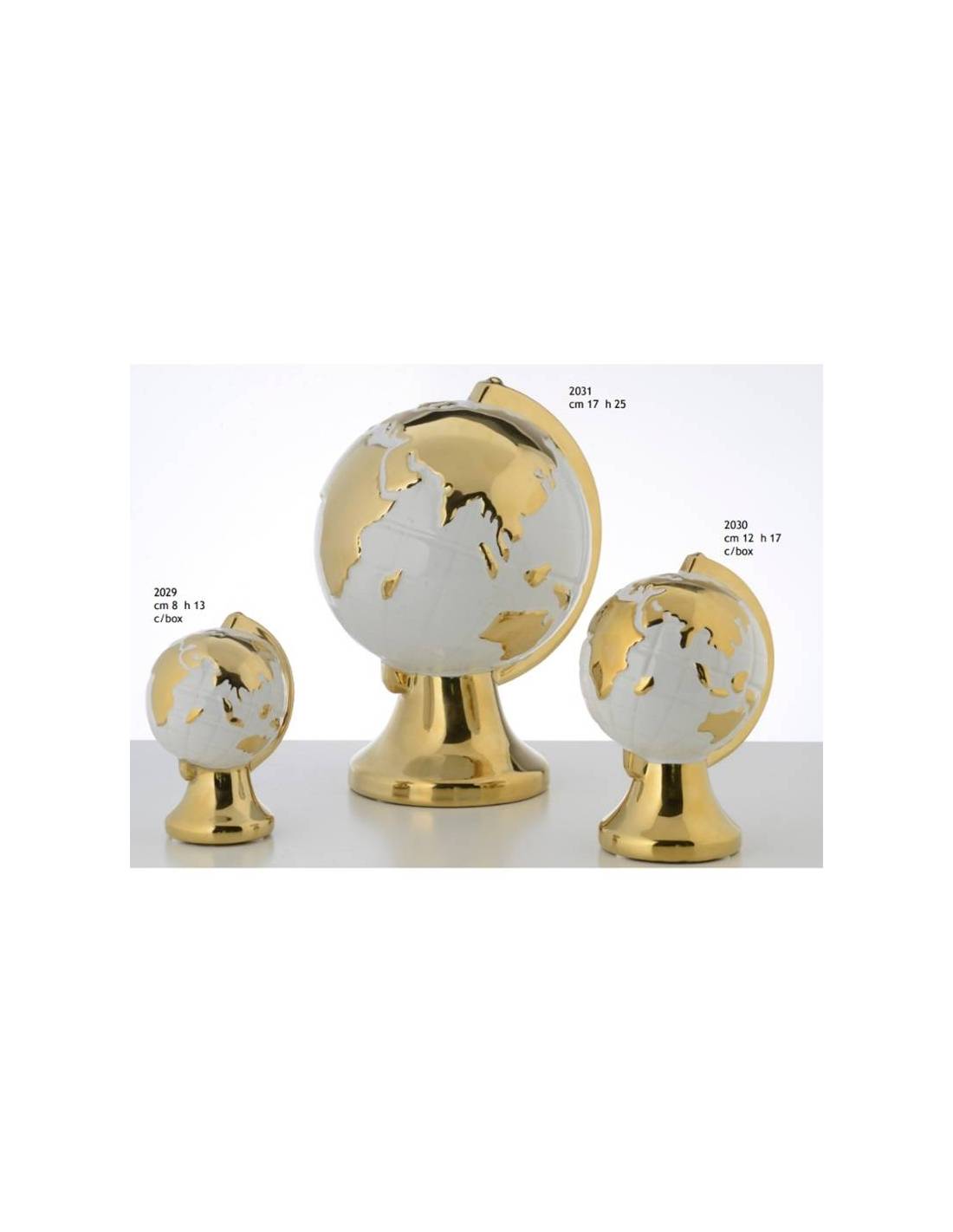 Mappamondo bomboniera in ceramica bianca con dettagli dorati con possibilità di scelta tra varie dimensioni.