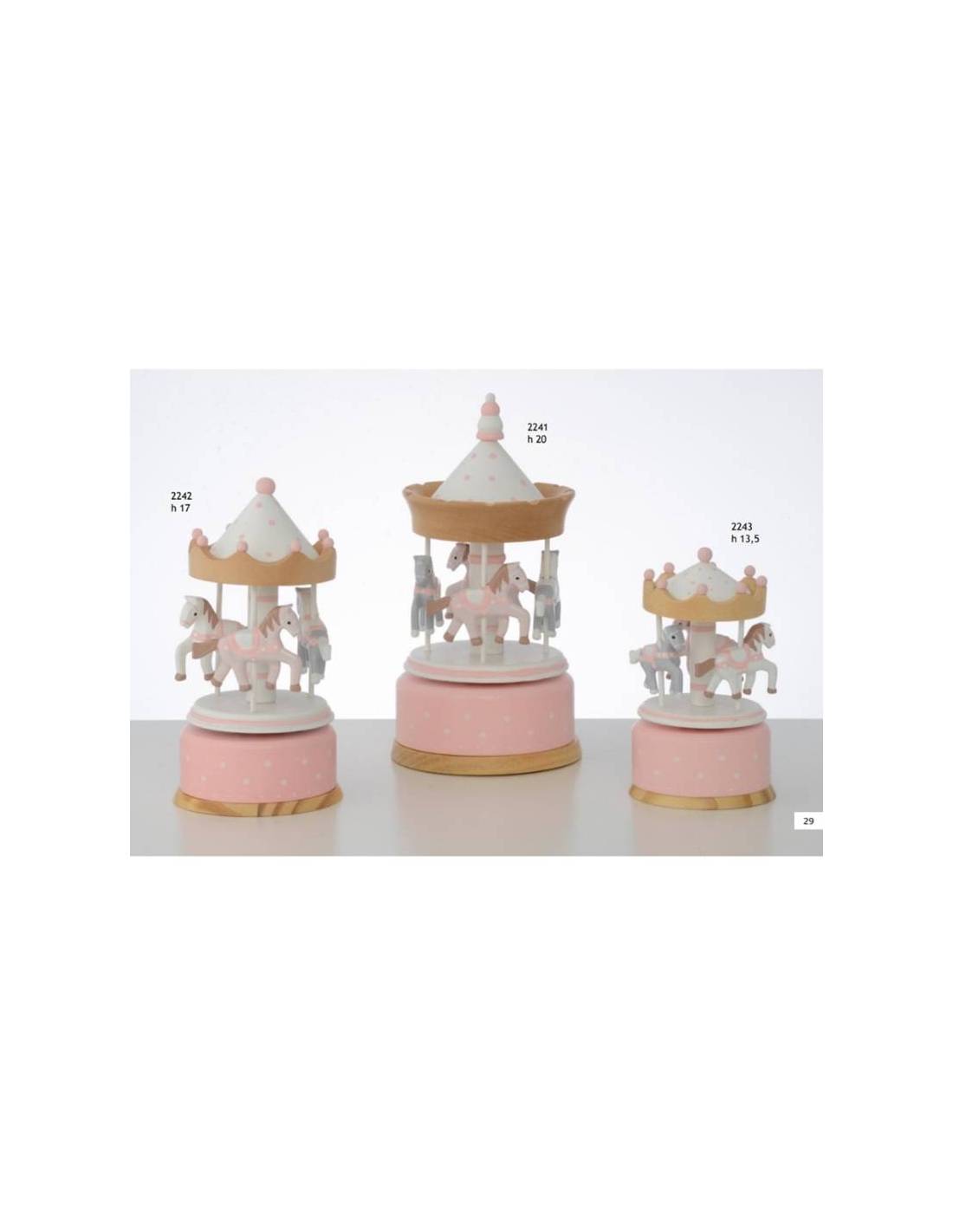 Bomboniere cavalli giostrina carosello in legno bianco e rosa disponibili in varie dimensioni.