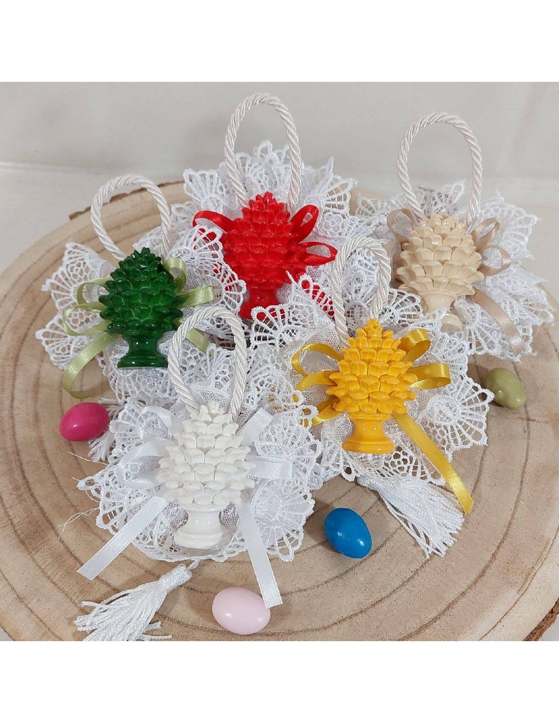 Gessetti bomboniere in gesso con dettagli incisi e con incastonato un grazioso cuoricino in legno, che può essere abbinato ad un sacchetto compreso di fiocco.
