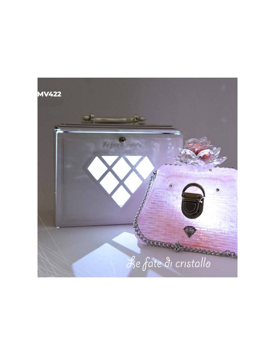 Borsetta bomboniera lampada luce led con boccetta profumo a forma di fiore e valigetta firmata Le fate di cristallo.