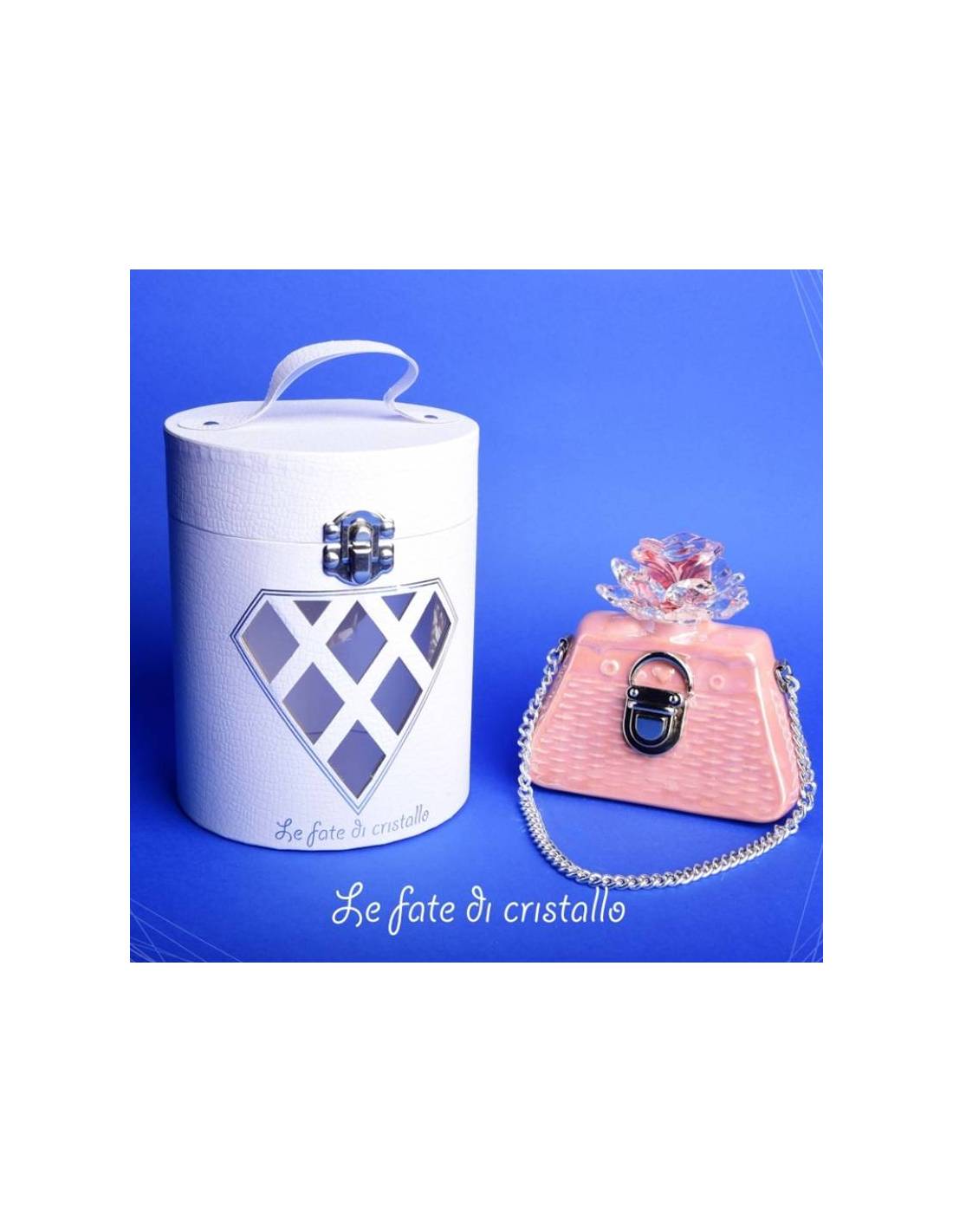 Bomboniere fiori boccetta porta profumo su borsa rosa con catena argentata con incluso contenitore borsa Le fate di cristallo.