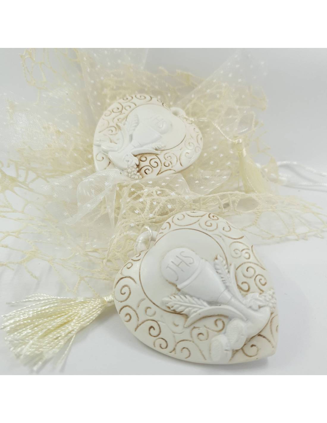 Bomboniere comunione economiche a forma di cuore con nappa color panna. Il cuore in resina dai colori tenui ha al centro l'immagine in rilievo del calice jhs  effetto marmo.