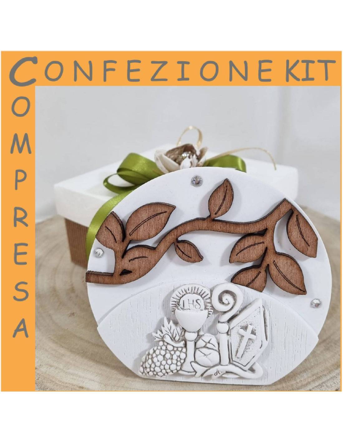 Queste bomboniere Comunione e Cresima sono dei veri oggetti d'arredo dalle linee moderne e tondeggiante con decoro floreale in legno, in rilievo l'icone sacre dell'evento.