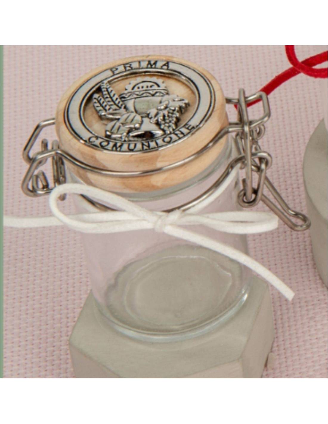 Le bomboniere Comunione barattoli hanno il tappo con il simbolo della Eucarestia in zama e legno.