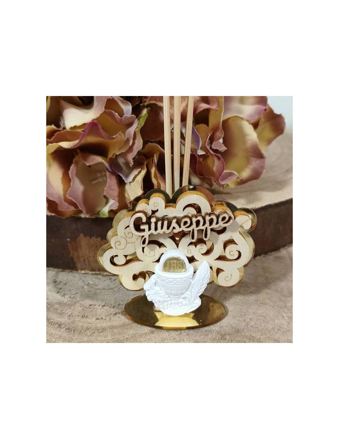 Portapenne che rappresentano una nuvola beige con stelline dorate e un angioletto seduto e una penna con strass. O puoi scegliere la candela in vetro con tappo in sughero con angelo sopra.