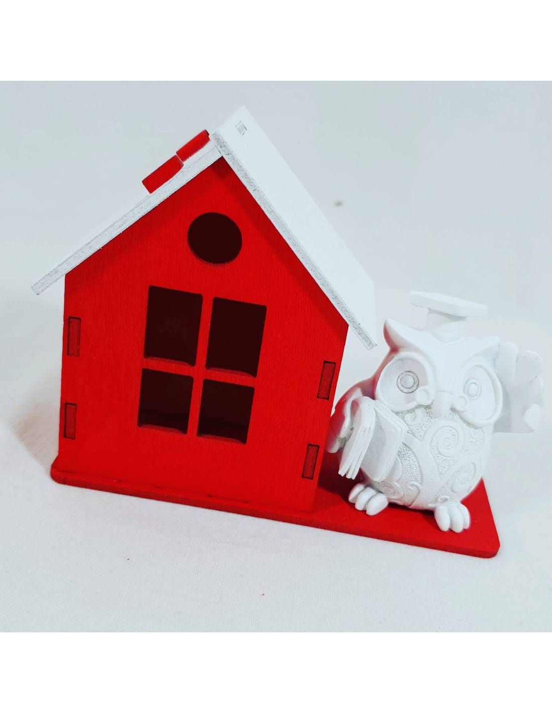 Gufo laurea bomboniere con casetta legno rossa, originali portaconfetti a prezzi ingrosso online. Il gufo bianco in resina è ideale per qualsiasi corso di laurea, è ben fatto nei minimi particolari, ha il libro in mano, il tocco in testa ed è applicato sulla base della casetta. La casetta è una scatolina portaconfetti in quanto basta togliere il tetto e inserire all'interno il sacchetto con i confetti. Puoi acquistare le bomboniere laurea fai da te o selezionare il kit di confezionamento che comprende il sacchetto con tiranti, il bigliettino e i confetti in blister facilissimo da assemblare , guarda il nostro video tutorial cliccando qui