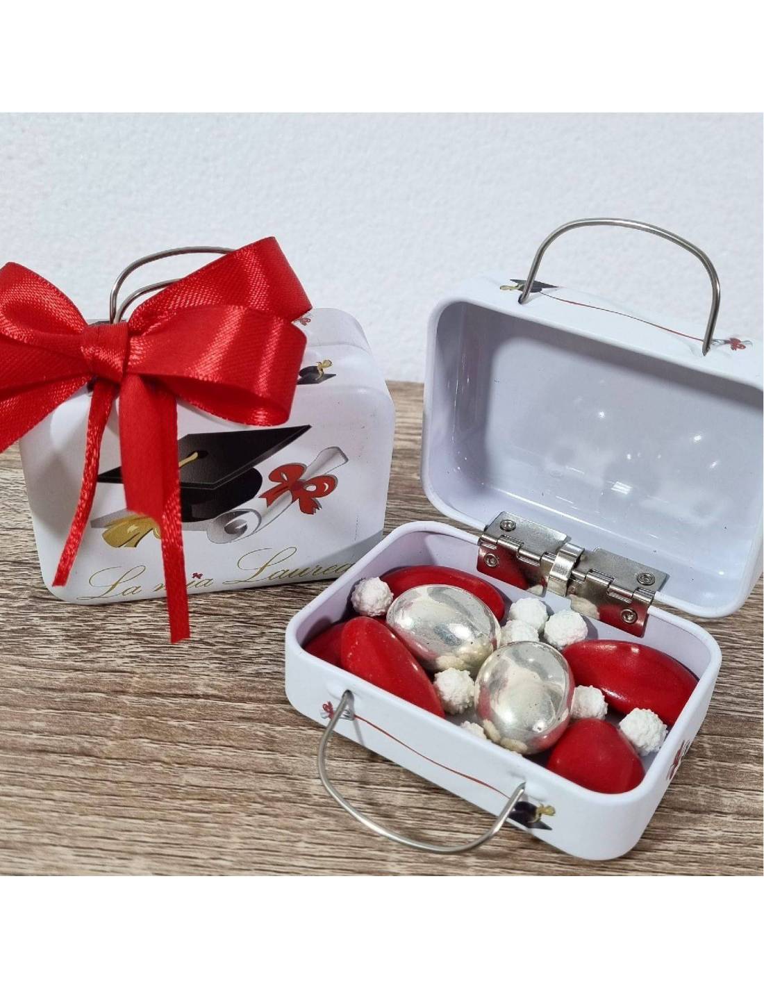 La bomboniera rappresenta un portaconfetti a forma di valigia dei tuoi ricordi di università apribile in cui inserire i confetti blisterati.