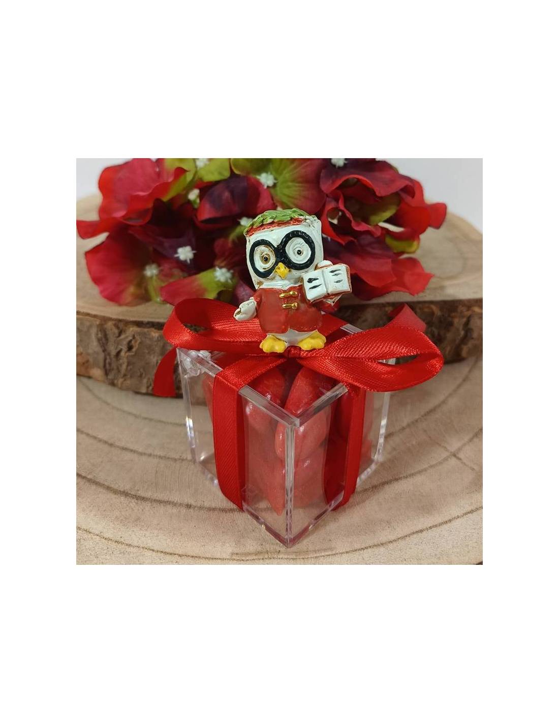 Bomboniere gufetto laurea su scatola in plexiglass con inclusi 5 confetti rossi al cioccolato.