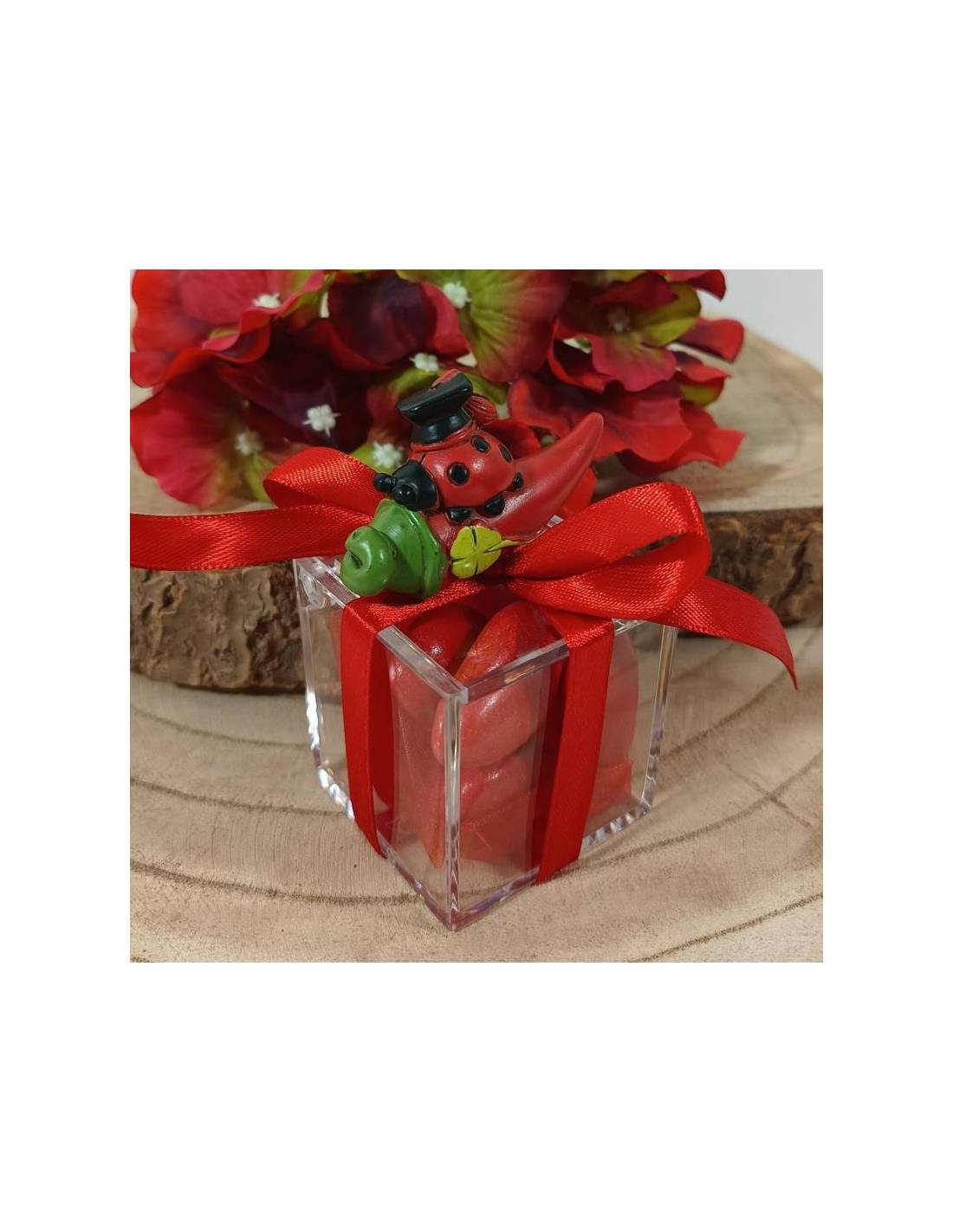 Le scatoline bomboniere per laurea in lingue otre al tocco rosso in plexiglas e coccinella hanno il nome in legno del laureando/a.