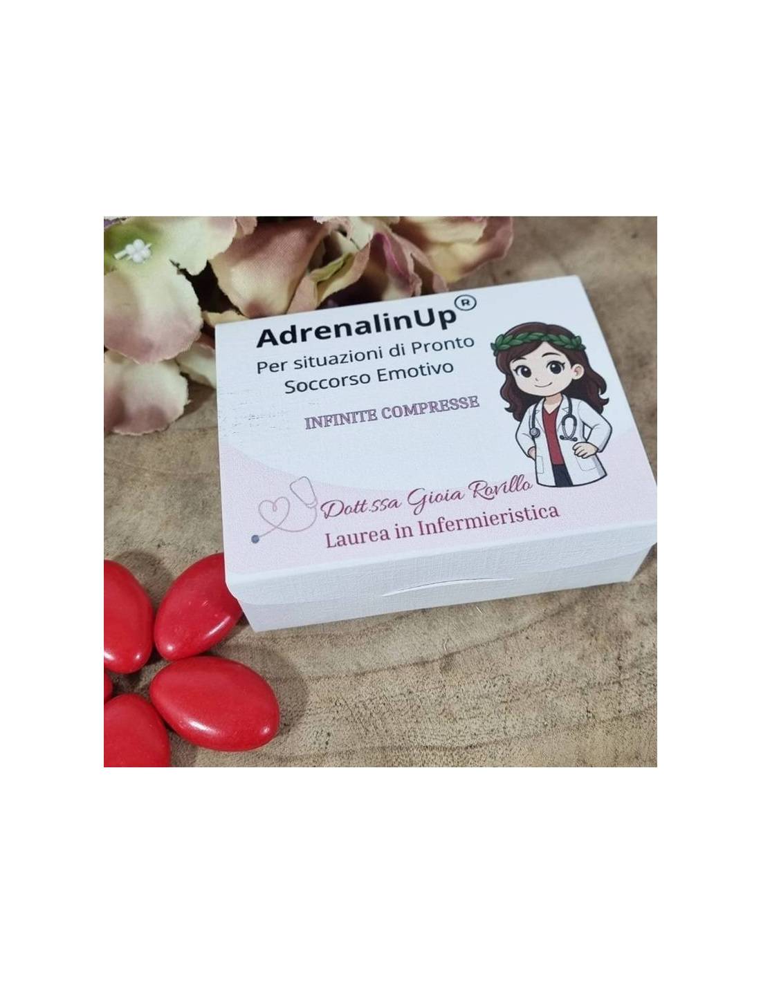 Inclusi nel prezzo confetti al cioccolato rossi e bigliettini.