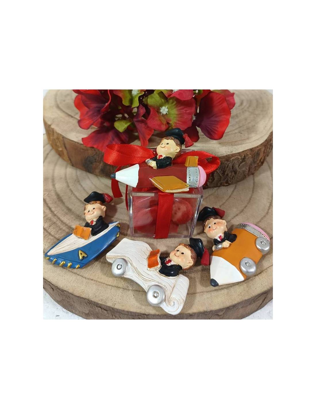 Bomboniere Laurea originali scatole portaconfetti forma cubica in plexiglass trasparente con nastro rosso in raso.