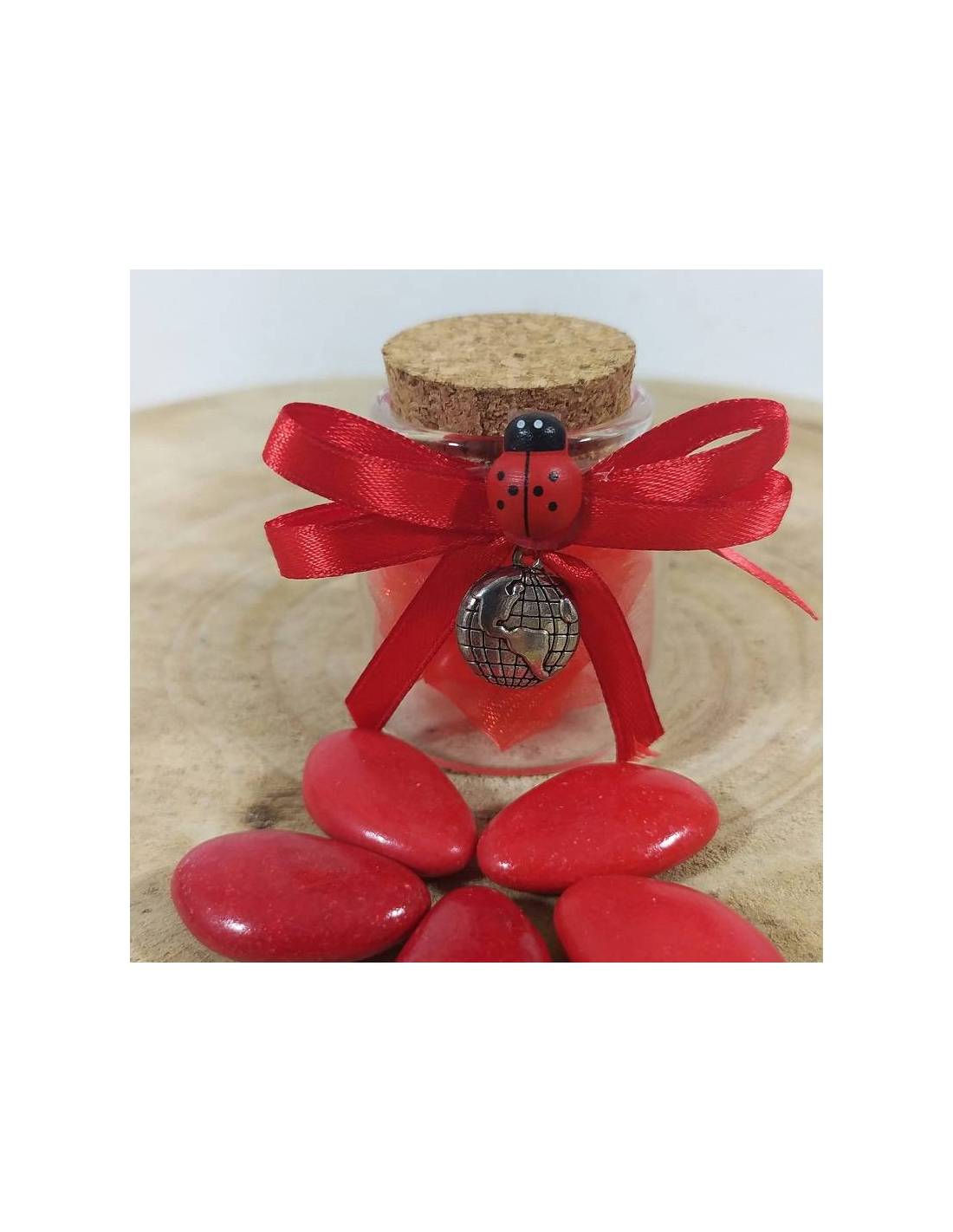 Bellissima bomboniera composta da vasetto porta confetti in vetro con tappo in sughero decorato da fiocco rosso, colore della laurea, e coccinella porta fortuna. Inoltre, vi è l'aggiunta di una medaglietta in zinco raffigurante un mappamondo, simbolo della laurea in materie geografiche, geologiche, ecc.