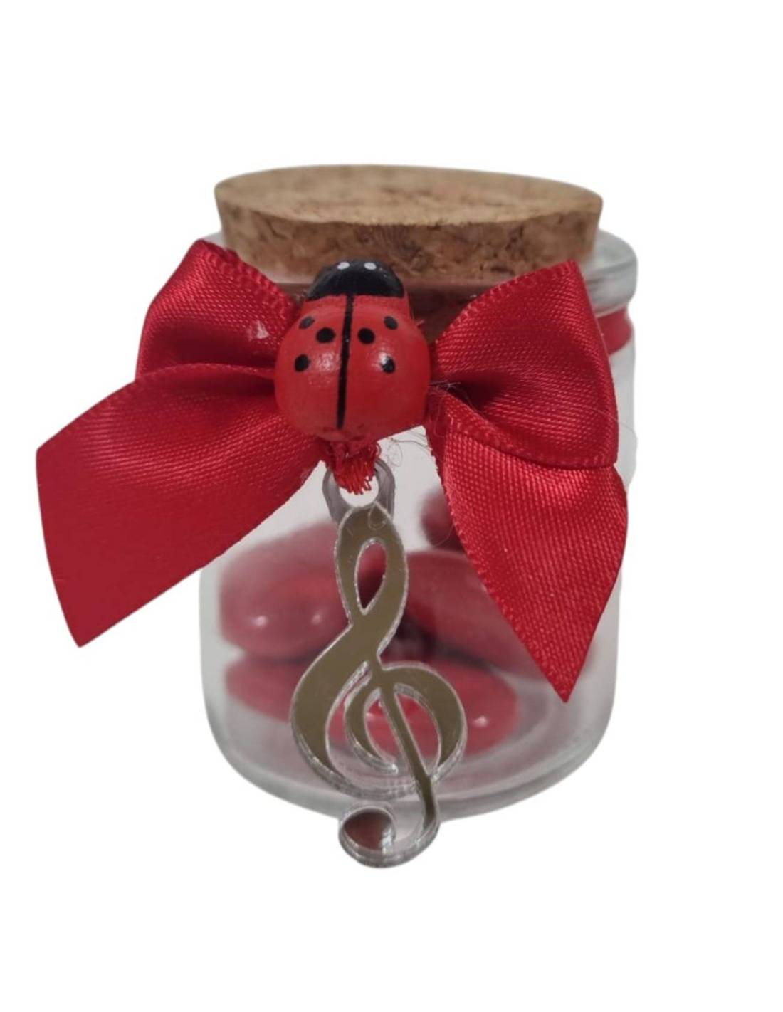 Bellissima bomboniera composta da vasetto porta confetti in vetro con tappo in sughero decorato da fiocco rosso, colore della laurea, e coccinella porta fortuna. Inoltre, vi è l'aggiunta di un pendente raffigurante una chiavi di violino in PLEXIGLASS, simbolo della laurea in conervatorio, musica.