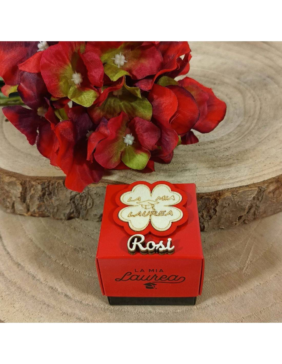 Scatoline laurea in cartoncino rosso e nero con la scritta laurea decoro in legno a quadrifoglio e nome laureando/a.