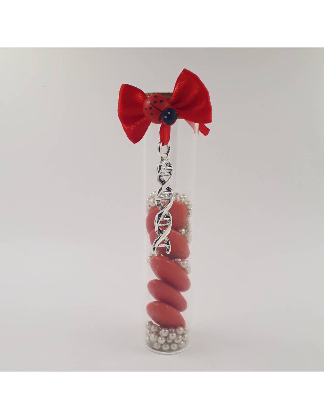 Provetta in vetro per laurea decorata con nastro rosso e con applicazione coccinella portafortuna. Oltre ai confetti e bigliettino, è presente un ciondolo in microfusione a forma di DNA.