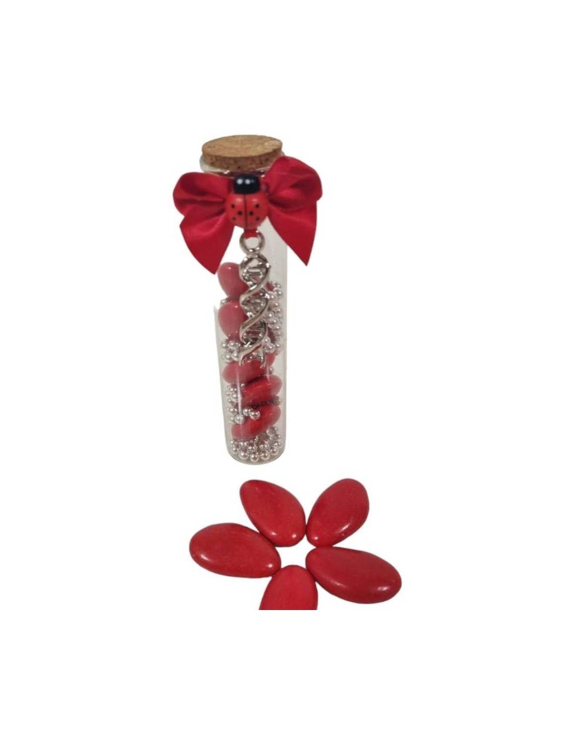 KIT PER IL CONFEZIONAMENTO E CIOE': provetta, fiocco rosso, 5 confetti in blister sigillato, bigliettino, confetti, 1 coccinella, nastrino rosso e 1 pendente DNA tutto molto facile da assemblare; per vedere L'ESEMPIO di confezionamento guarda il video clicca qui