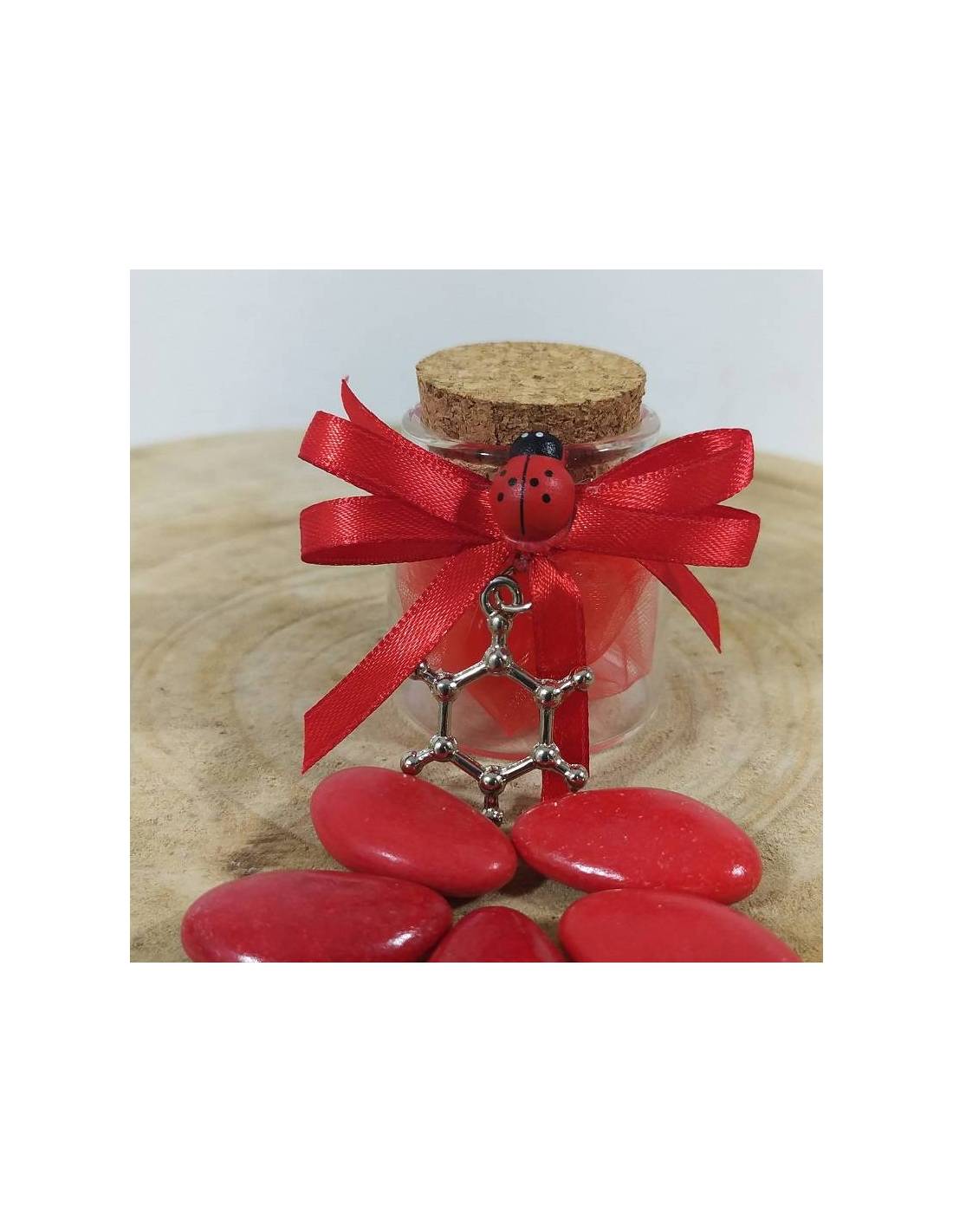 Vasetto portaconfetti laurea biologia e chimica decorato con nastro rosso con pendente a forma molecola