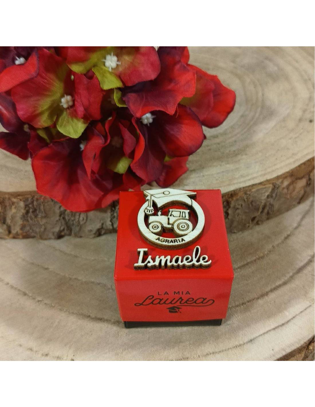 Aprifesta segnaposto economica adatta per feste di laurea. La scatolina è rossa con disegno di tocco e scritta laurea (dimensione 6,5 x 9cm circa), comprensiva di fiocchetto con coccinella confetti e bigliettino.