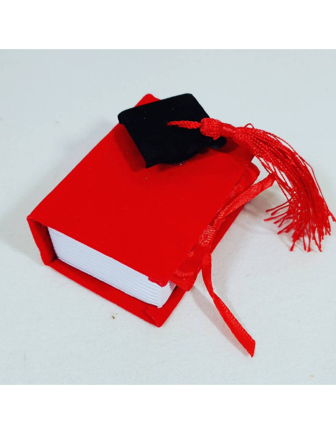 Kit Portaconfetti laurea per bomboniere laurea. Confettata laurea economica ed originale! scatolina a forma di libro in velluto con applicazione tocco nero e nappa rossa con tiranti in raso per chiudere la scatolina.