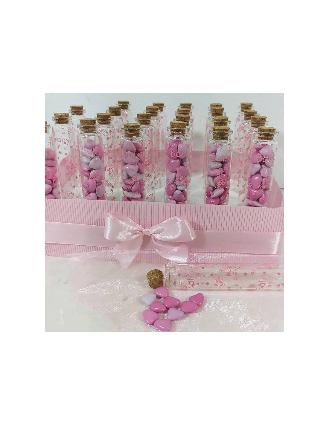 Come si può ben vedere dalle foto, sulla provette in vetro vi è una stampa con scritta 'baby' e tanti decorazioni tema nascita.