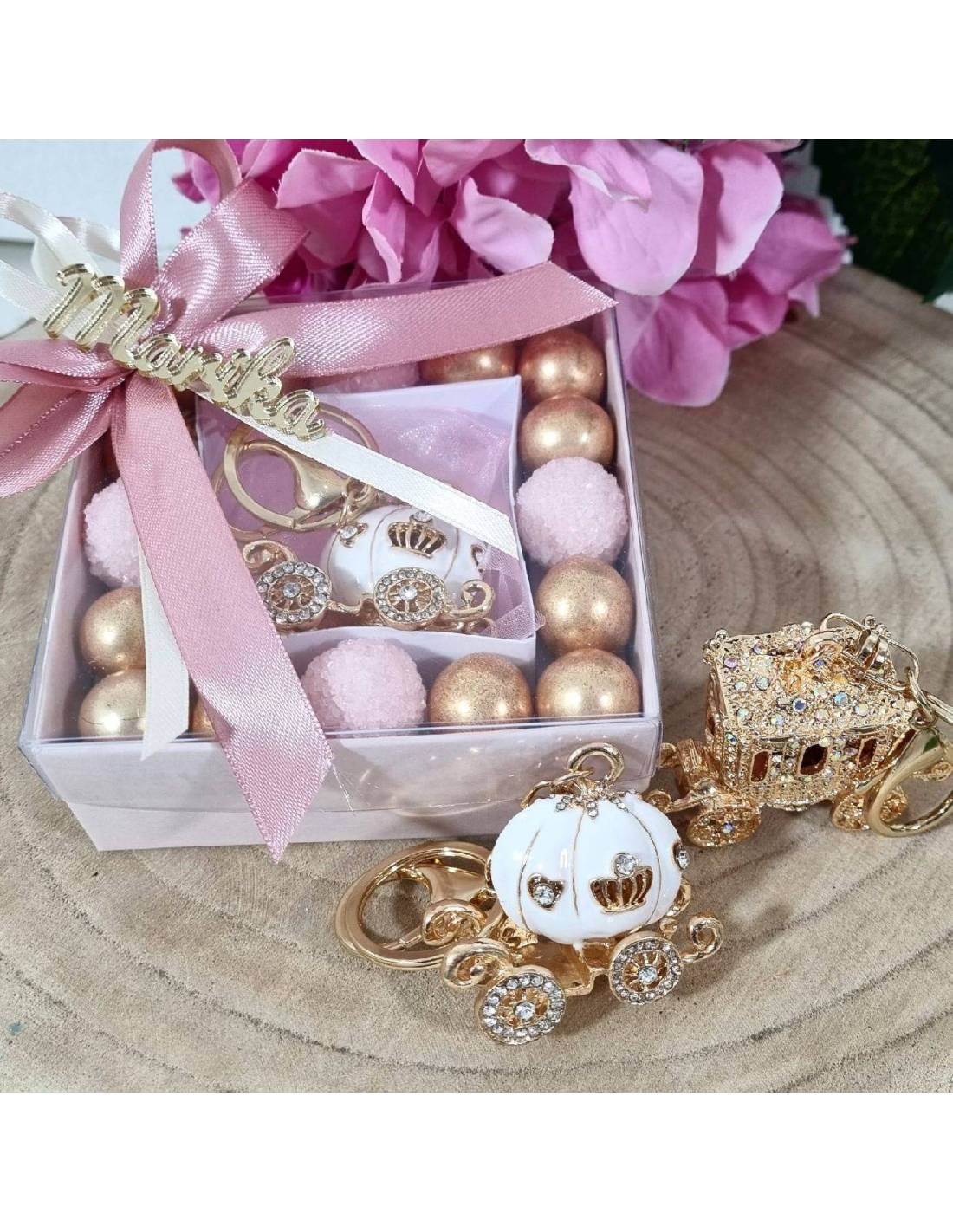 Portachiavi bomboniere carrozza di cenerentola in acciaio dorata in due versioni con scatola degustazione confetti.