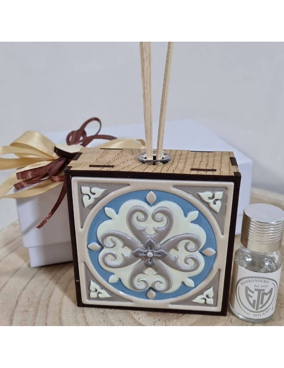 Bomboniere profumatori ambiente in legno con la parte anteriore a mattonella con decoro maiolica.