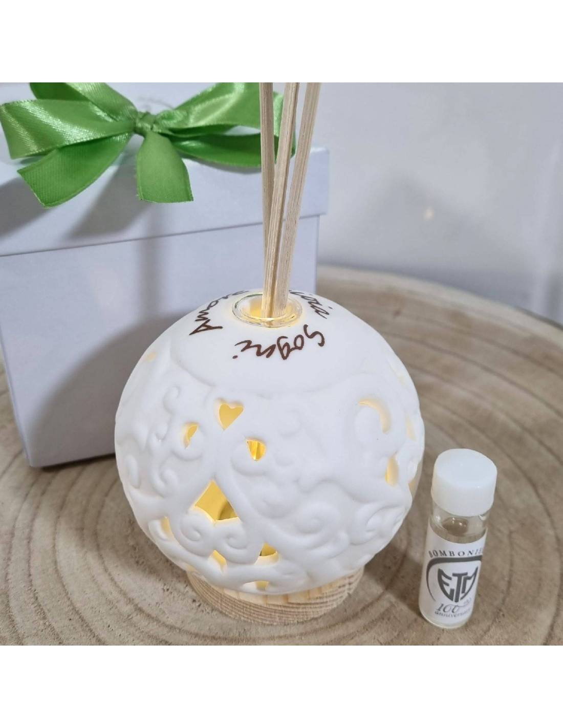 Bomboniere profumatori ambiente con la stampa delle parole: sogni. amore e gioia complete di bastoncini, profumo e scatola.