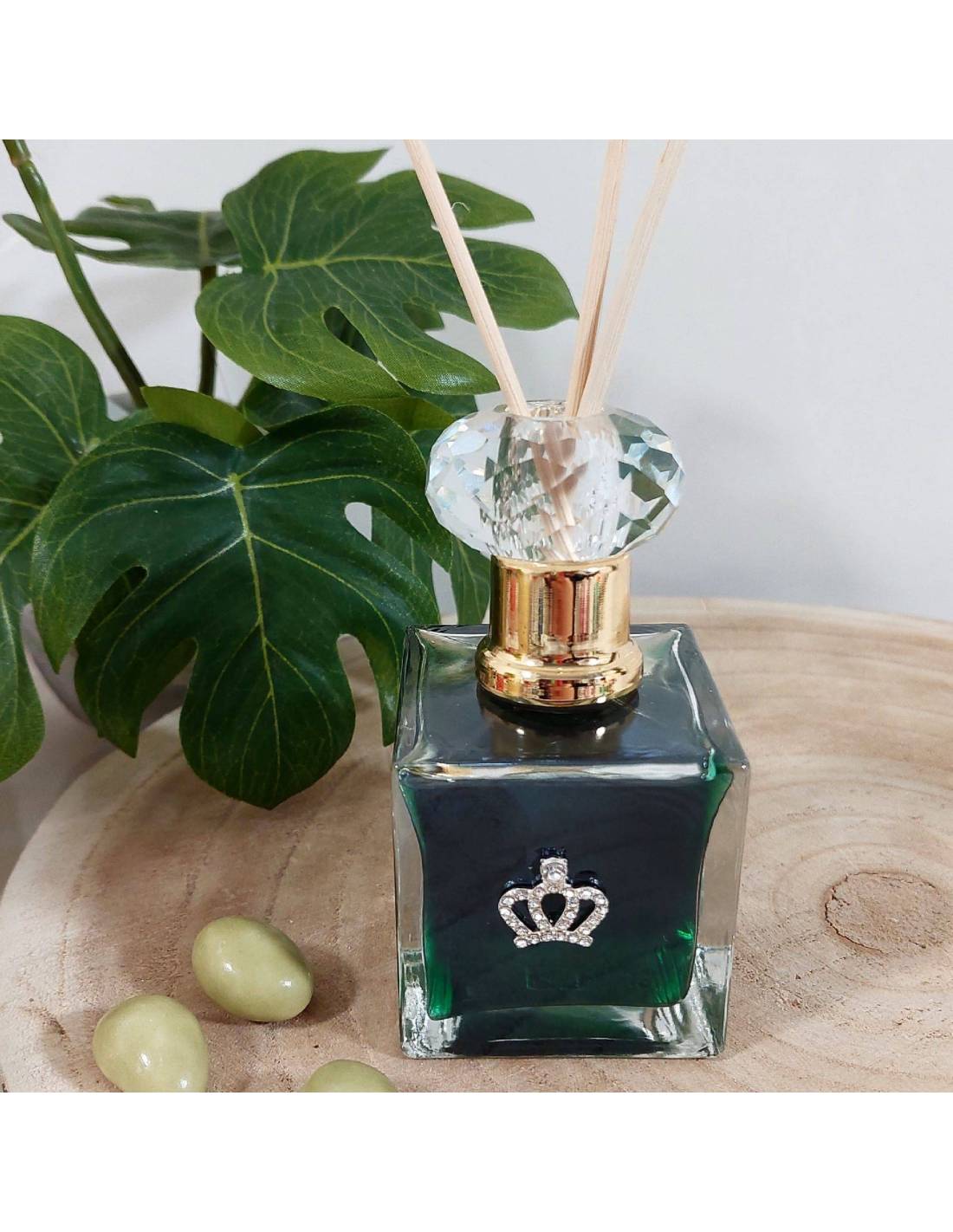 Profumatore ambiente bomboniere con profumo di colore verde in bottiglia quadrata con tappo in cristallo e collo dorato in abbinamento alla corona di strass che lo decora.