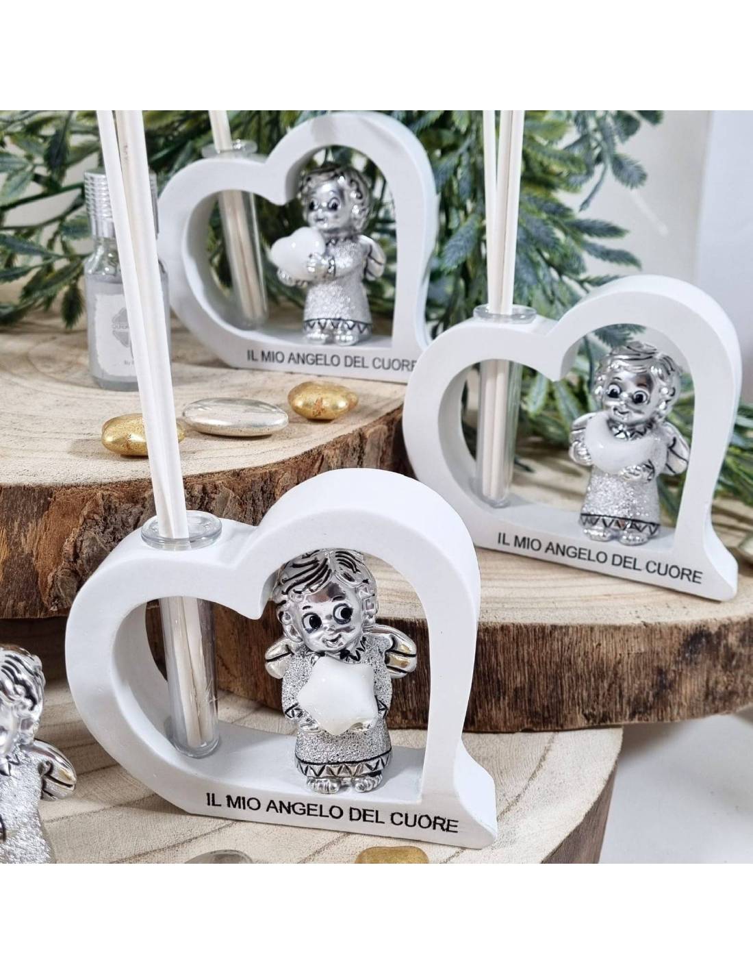 Graziosi angioletti bomboniere in resina dipinti e decorati a mano con frase sulla base a forma di cuore. Bomboniere solidali profumatori cuore con boccetta in cui inserire il profumo e bacchette.
