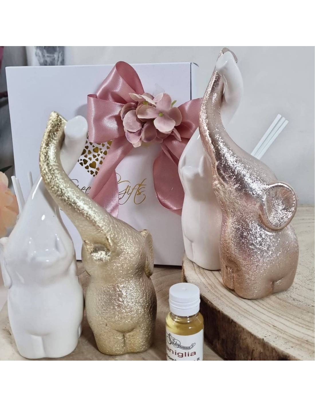 Bomboniere diffusori di profumo elefanti innamorati completi di confezione con kit di confezionamento personalizzabile.