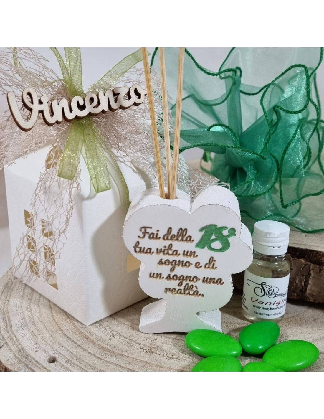 Bomboniere diffusori diciottesimo complete di scatola shopper, nome in legno, nastro, sacchetto, confetti verdi, profumo, bastoncini.