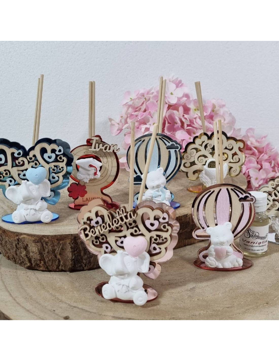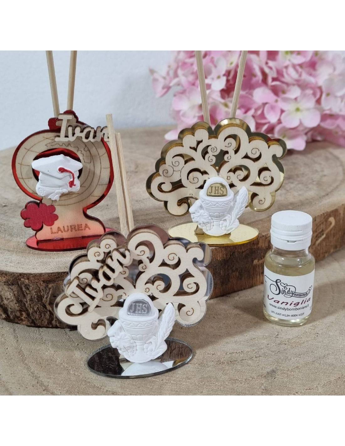 Bomboniere profumatori ambiente personalizzati con il nome in legno del festeggiato/a