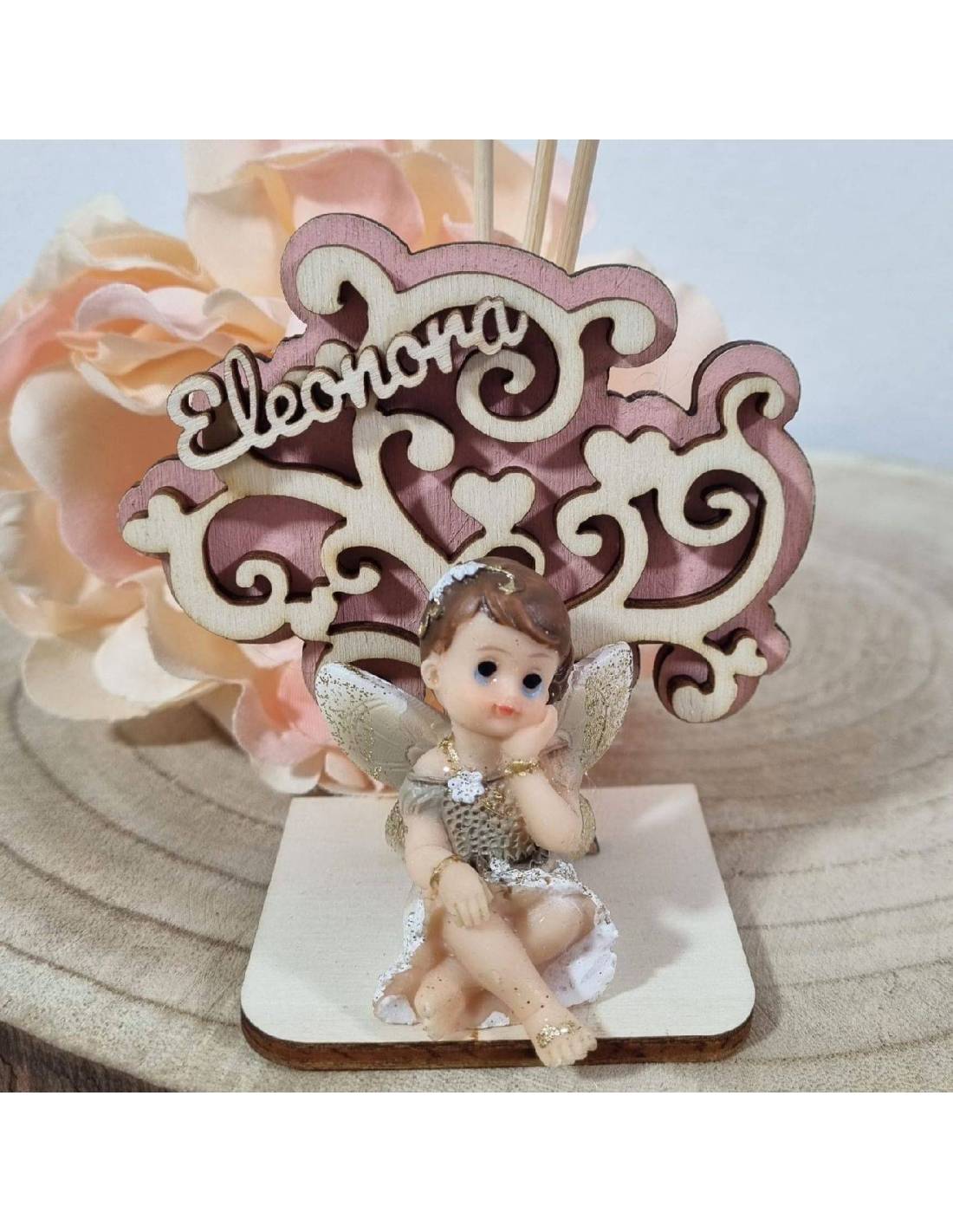 Profumatore bomboniera fatine con ali glitter e nome in legno della festeggiata da completare con la confezione a scelta.