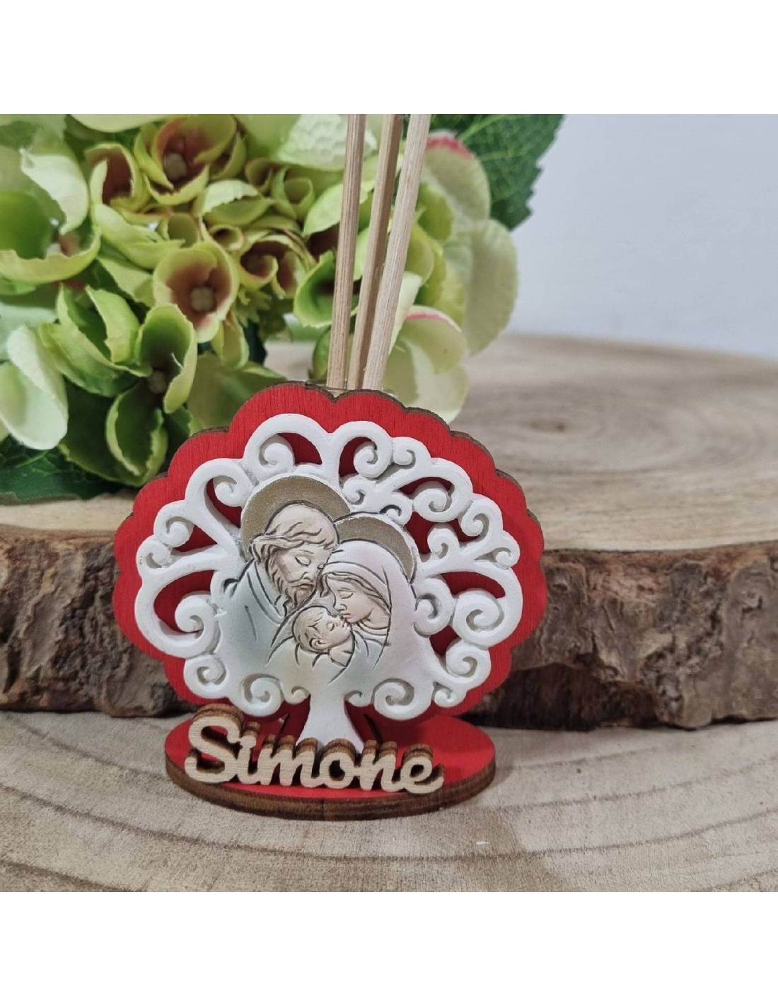 Bomboniere albero della vita profumatore in legno rosso con albero in polvere di ceramica bianco con in rilievo la Sacra Famiglia ideali per Cresima.