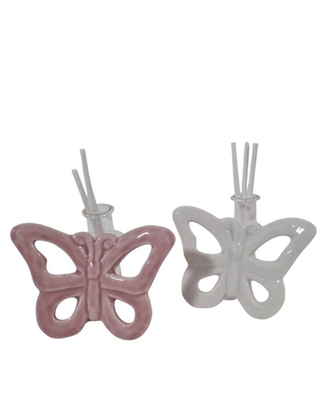 Bomboniera farfalla profumatore in ceramica lucida in 2 colori bianca e rosa con provetta incastonata nella parte posteriore.