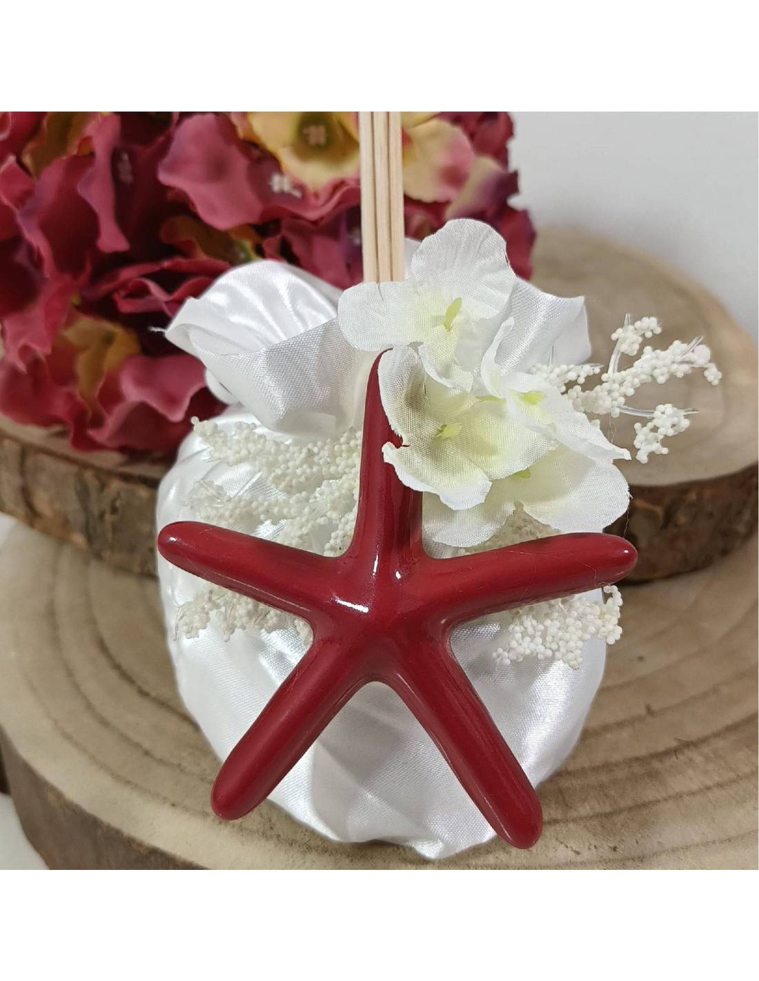 Il bon bon bomboniera profumatore è decorato con fiori in stoffa e fiore in ceramica centrale e ti arriverà pronto come in foto.