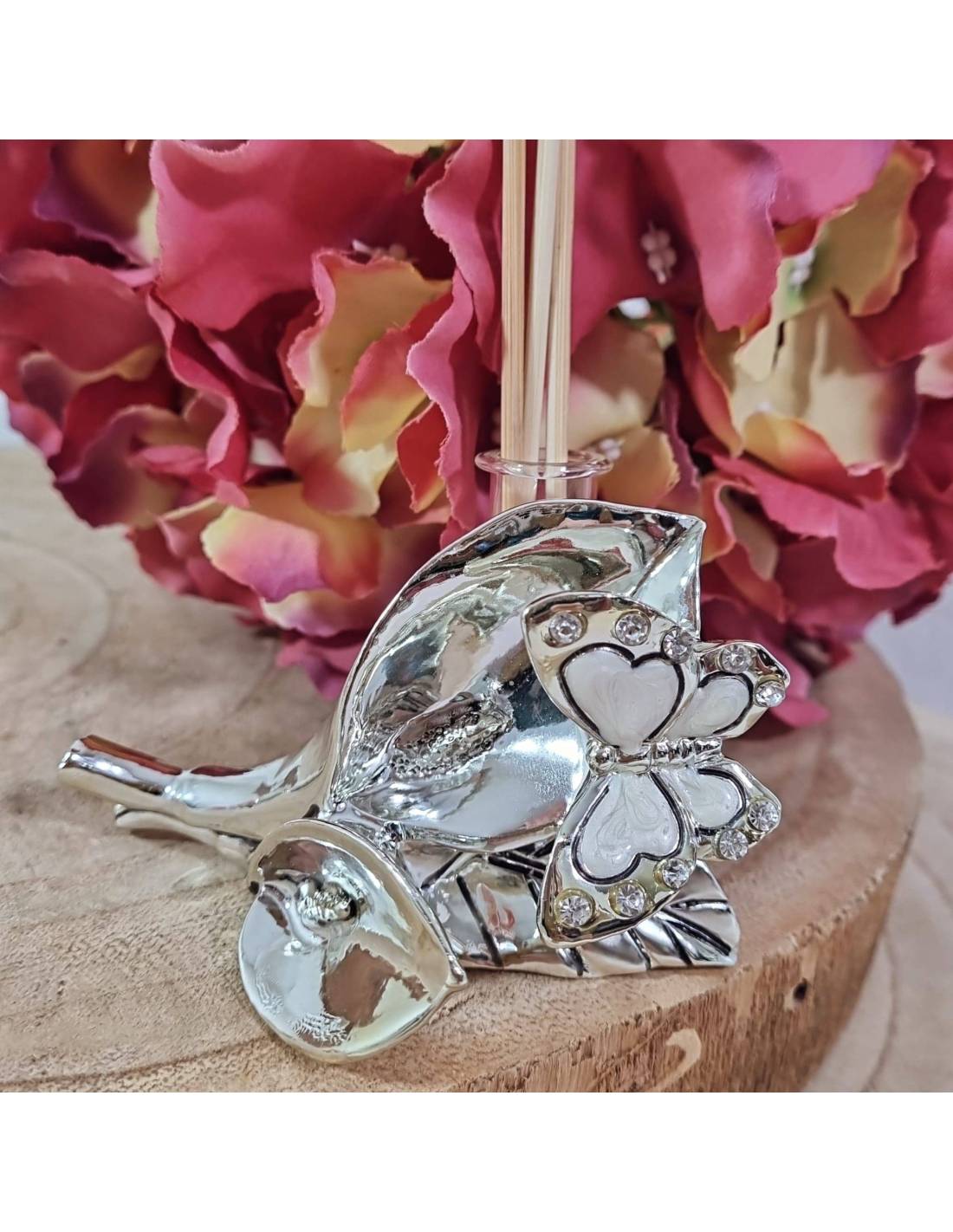 Bomboniera profumatore che rappresenta una farfalla con strass su fiori di calla. con provetta incastonata dove inserire il profumo e i bastoncini inclusi.