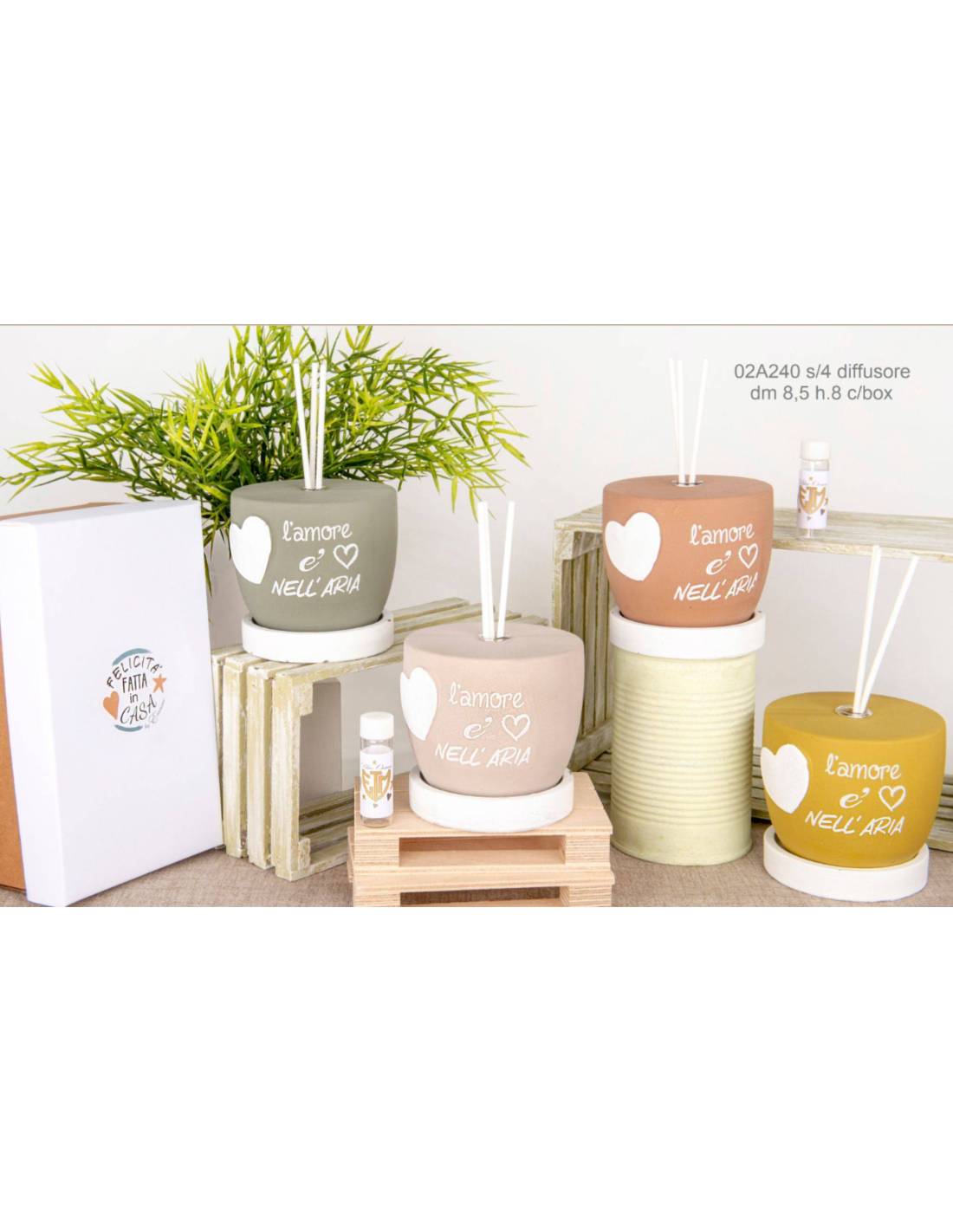 Profumatori ambiente bomboniere in ceramica in 4 colori completi di scatola regalo, bastoncini e profumo.