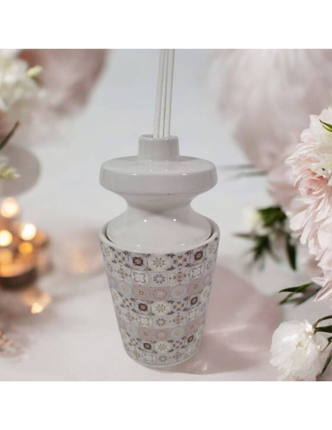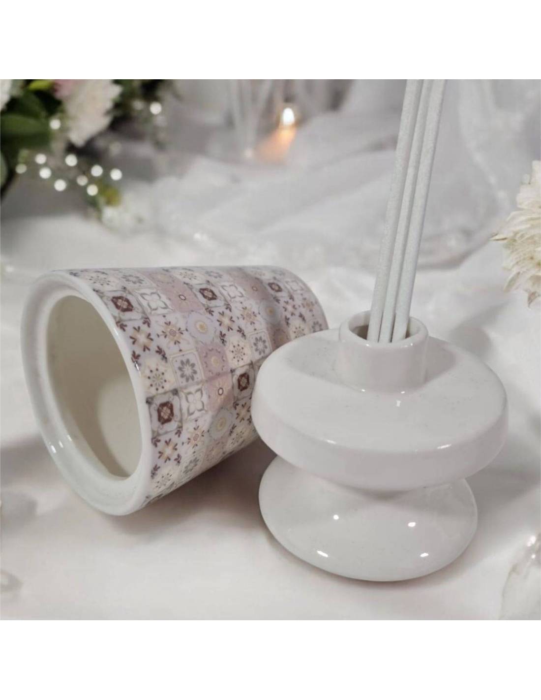 Profumatori bomboniere 2025 in ceramica bianca con decoro maioliche dalle tonalità del rosa antico.