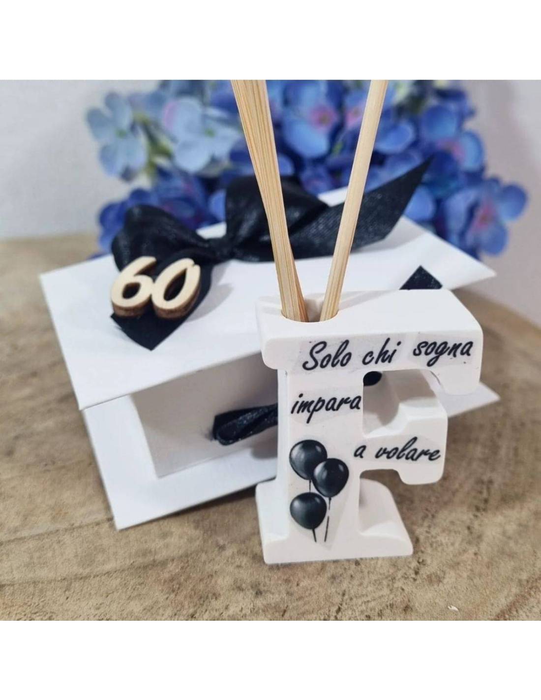 Bomboniere profumatori ambiente con nome in plexiglass con max 9 lettere completo di confezione a kit fai da te, ma con un costo aggiuntivo puoi riceverle già confezionate.
