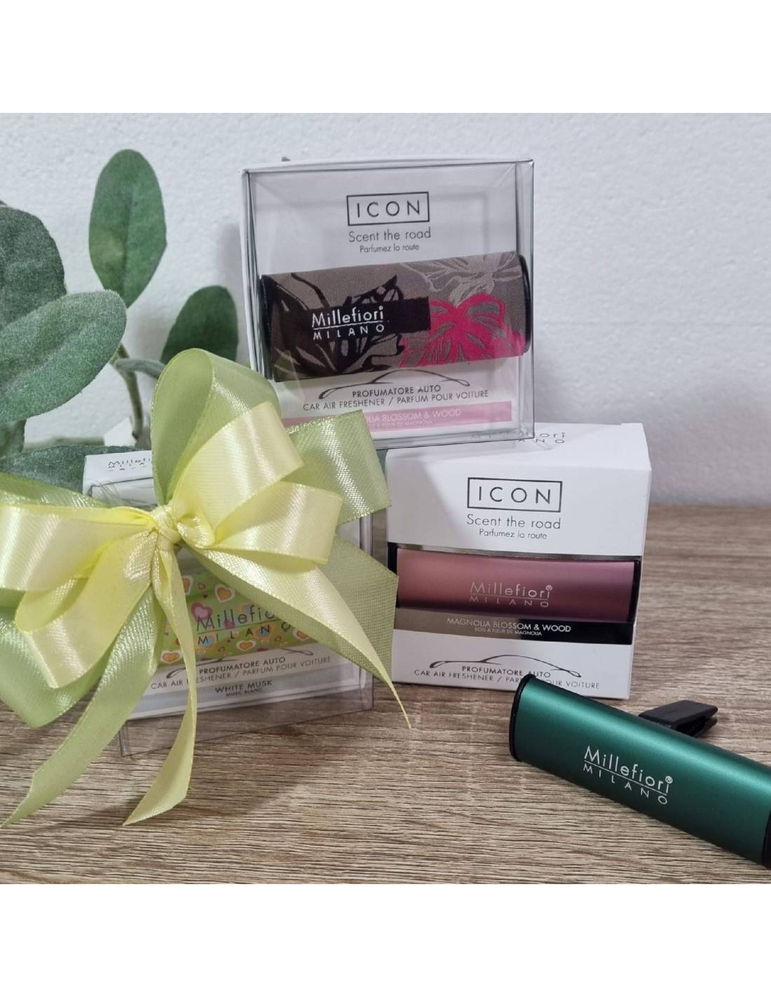Profumatore bomboniera auto della Millefiori con decori diversi tra loro e completi di ricarica profumo.