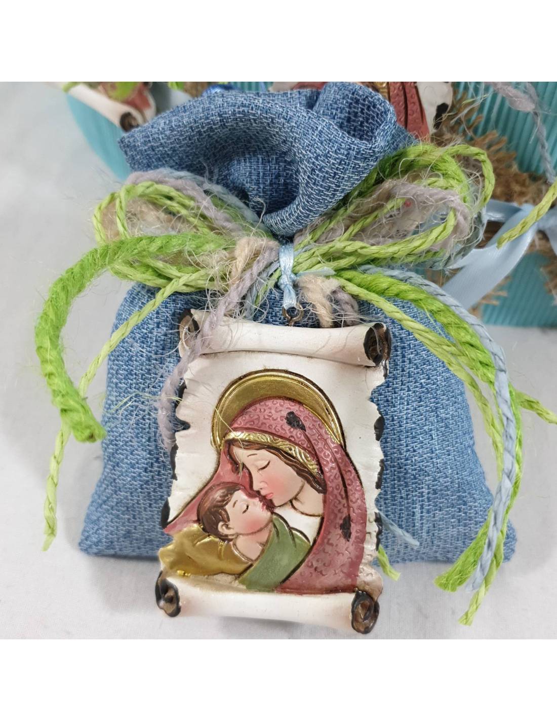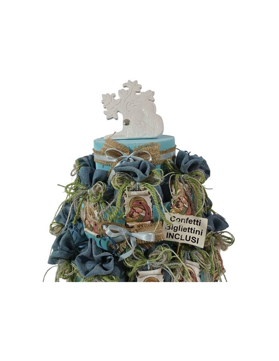Sacchetti per confetti in cotone effetto jeans con tiranti e applicazioni a forma di timone e di ancora, facili da confezionare. Il sacchetto comprende il fiocco con l'applicazione +ovatto ed eventuale bigliettino e confetti.