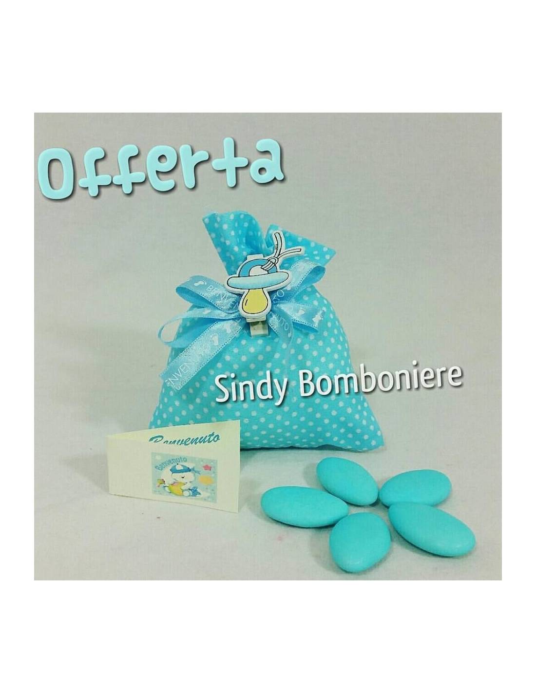 Sacchettini delicati e carini con molletta ciuccio e nastrino in raso con scritta E' NATO UN BIMBO E BENVENUTO