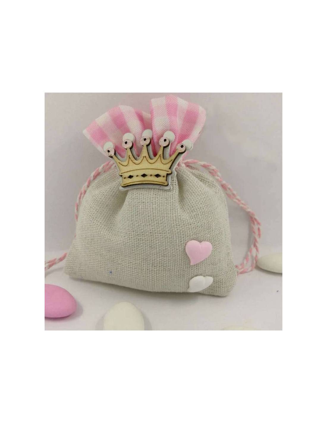 Sacchetti battesimo bimba bicolore con applicazione in legno a forma di corona e 2 cuoricini gessetto rosa e bianco. Sacchetto juta che ha la parte inferiore color panna e la parte superiore a quadratini rosa e bianco con tiranti laterali in tinta.